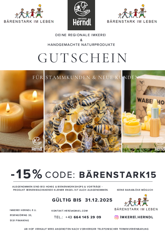 Dir gefallen die Angebote von der Imkerei Herndl und du möchtest diese gern ausprobieren? Dann löse gleich den Gutschein dafür ein!