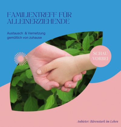 Dieser digitale Familientreff richtet sich speziell an allein erziehende Mütter und Väter. Ihr habt Gelegenheit, euch mit anderen Alleinerziehenden auszutauschen. Vielleicht seid ihr euch sympathisch und es ergeben sich weitere Treffen, auch mit den Kindern. Du hast Interesse? Dann schreib uns eine Mail an info@baerenstark-im-leben.com. Du erhältst eine Mail mit dem Einwähllink und weiteren Infos im Anschluss. Dieses Angebot ist kostenlos für dich und wird angeboten von Bärenstark im Leben, ...